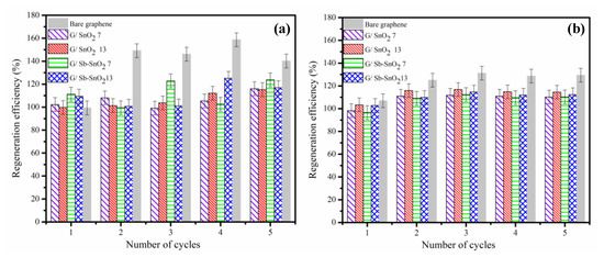 As shown in Figure 6a,b, the electrochemical oxidation resulted in no reduction of regeneration efficiency, even after five cycles. Figure 6a,b also shows that the change in regeneration efficiency of the bare graphene was much more than the G/SnO2 and G/Sb-SnO2 nanocomposites. This increase in the regeneration efficiency was due to the oxidation of the bare graphene during electrochemical regeneration, which led to the creation of more adsorption sites, either by increasing the surface area or the number of functional groups [15,41]. The adsorptive capacity and consequently regeneration efficiency of the nanocomposites changed less than for bare graphene, which suggests that the addition of the SnO2 and Sb-SnO2 provides some protection of the surface of the graphene from oxidation. By comparing Figure 6a,b, it is evident that the regeneration efficiency of the adsorbents in sodium sulfate increased less than that observed with sodium chloride. This result is consistent with the charge loading results (Figure 5a,b, and Figure S1a,b and confirms that there is a greater tendency for surface oxidation of the graphene using NaCl electrolyte.
