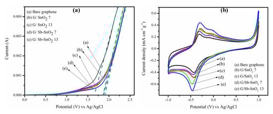 In order to assess the electrochemical characteristics of the nanocomposites, linear sweep voltammetry (LSV) was carried out. Figure 7a shows the results for bare graphene, G/SnO2, and G/Sb-SnO2 nanocomposites, in which the current flow was measured as the applied potential was increased. The experiments were performed in 0.5 M Na2SO4 at a scan rate of 100 mVs−1, with Ag/AgCl and platinum wire used as reference and counter electrodes respectively. Onset potentials of 1.65, 1.87, 1.87, 1.9, and 1.87 V were measured for bare graphene, G/SnO2 7, G/SnO2 13, G/Sb-SnO2 7, and G/Sb-SnO2 13 adsorbents, respectively, for the oxygen evolution reaction. The delay in the onset potential indicates the suppression of this side reaction and increasing the charge efficiency for generating reactive oxygen species. Such a trend has also been observed by different researchers for SnO2 and Sb-SnO2 electrocatalyst materials [21,25,43,44].