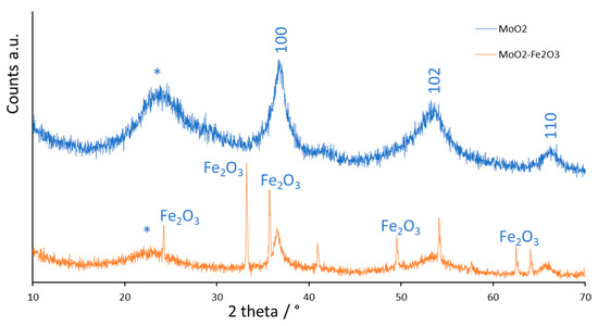 Powder X-ray diffraction (XRD) for the calcined MoO2 and MoO2–Fe2O3 nanoparticles (NPs) (* denotes silica diffraction peak from the support glass slide).