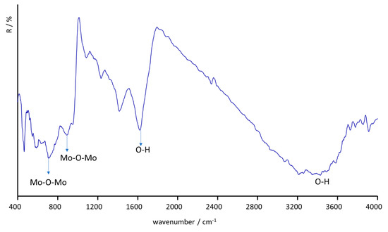 Fourier-transform infrared spectroscopy (FTIR) was used to characterize the calcined MoO2 NPs, as shown in Figure 3. Given that ethylenediamine and hydroquinone were removed by a calcination step, this spectrum was simpler than when the calcination step was not carried out [11]. In this way, the FTIR spectrum of the MoO2 NPs was typical of a Mo oxide, showing a broad band at 3417 cm−1 ascribed to the stretching modes of the hydroxyl groups at the surface of the MoO2 nanoparticles. The absorption band at 1626 cm−1 was due to the O–H bending modes [16,17]. Other bands observed at 894 and 711 cm−1 could be ascribed to the vibration of the Mo–O–Mo bonds [18].