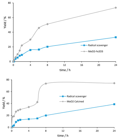 From the above results, it could be rationalized that the radical scavenger (2,6-di-tert-butyl-4-methylphenol) would compete for active sites at the surface of the catalysts, although this was hard to conceptualize. Given its structure with the bulky t-butyl groups ortho to the phenol group, it would be extremely difficult for this molecule to approach the surface and bind strongly. In this way, the results showed that there was good evidence that the mechanism involves a radical path. However, since a considerable level activity was also detected, it also demonstrated that there was an alternative path that was not radical. It was also possible to observe that the kinetics of the reactions presented differences from the previous ones (Figure 4 and Figure 5), showing that the reaction did not proceed at the same rate, as expected. When the MoO2 calcined catalyst was used with the radical scavenger, the reaction kinetics showed analogous trends, as observed for MoO2–Fe2O3. It is known from the literature that oxidation reactions catalyzed by metal oxides involve metal reduction/re-oxidation steps involving TBHP, while the migration of lattice oxygen also occurs [21,22]. These steps at some point may occur through radical species, which can be scavenged by the radical scavenger, leading to the observed rate decrease.