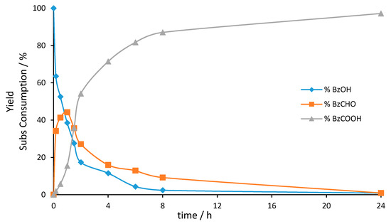 In Figure 7, it is possible to observe that the kinetics of the reaction had a higher rate when more oxidant was added after 4 h reaction time. At 4 h reaction time, 24% conversion was obtained and at 6 h (2 h after the addition of a new amount of oxidant), almost 60% conversion was reached. From 6 h to 8 h reaction, the kinetics was slower again and only 72% conversion was obtained. At 8 h, more H2O2 was added again and the reaction proceeded from 72% to 94% after 24 h. A faster kinetics was not observed. However, the final conversion was improved, reaching 94% with 100% selectivity for benzaldehyde.