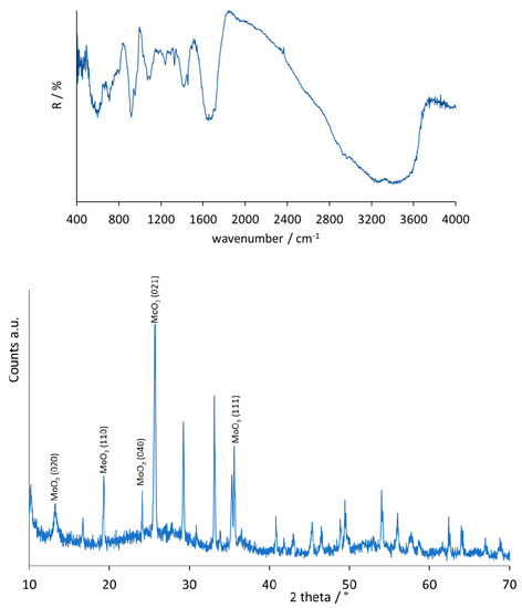 Infrared spectrum (top) and X-ray diffraction (XRD) powder pattern (bottom) of the MoO2 NPs after catalysis.