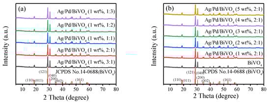 Figure 1 shows the XRD patterns of the different catalysts, in which the main peaks for the pure m-BiVO4 nanospheres can be observed, such as (110), (011), (121), (040), (200), (002), (161) and other characteristic peaks, which are consistent with the standard card of m-BiVO4 (JCPDS No. 14-0688) []. This shows that monoclinic scheelite phase m-BiVO4 has been successfully prepared, and the XRD pattern of the composite material Ag/Pd/m-BiVO4 is very similar to that of pure m-BiVO4. No obvious peaks of Ag and Pd were detected, which may be due to the smaller loading of noble metals and the smaller metal particles. This result also shows that the original crystal structure of m-BiVO4 will not be destroyed during the loading process. At the same time, no other crystal phases are generated, indicating that no impurities are generated during the loading process.