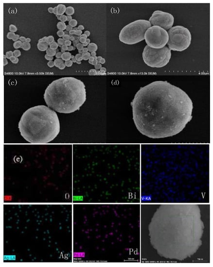 Figure 2 shows SEM images of the prepared catalysts that was used to characterize the morphology of the materials. It can be seen from Figure 2a, b that m-BiVO4 has a nano-microsphere structure with concave-convex structures on the surface. Figure 2c, d show SEM images of Ag/Pd/m-BiVO4 (2 wt%, 2:1). The overall structure of the composite nano-microspheres has not changed, except that the concave-convex structures on the surface are covered with granular metals. Figure 2e shows an element plane distribution map for Ag/Pd/m-BiVO4 (2 wt%, 2:1), showing the existence of Bi, V, and O and a uniform distribution of Ag and Pd nanoparticles on the surface.
