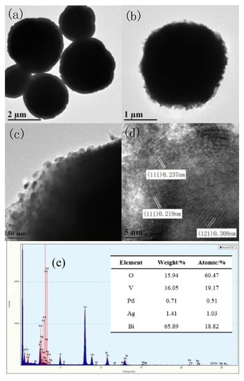 Figure 3 shows TEM images of the prepared m-BiVO4 and Ag/Pd/m-BiVO4 (2 wt%, 2:1) composite nanospheres. From Figure 3a, the spherical structure of the material can be observed, and from Figure 3b,c, the existence and good dispersibility of Ag and Pd particles on the surface of the nanospheres can be observed. Figure 3d shows an HRTEM diagram of Ag/Pd/m-BiVO4 (2 wt%, 2:1), in which lattice spacings of 0.308 nm, 0.219 nm and 0.237 nm can be observed, corresponding to the (121), (111) and (111) crystal surfaces of m-BiVO4, Pd and Ag []. Figure 3e shows the EDX spectrum of Ag/Pd/m-BiVO4 (2 wt%, 2:1), which is basically consistent with the actual content of each element in the material.