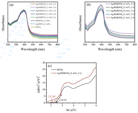 Figure 4a, b show UV-vis DRS diagrams of pure m-BiVO4 and Ag/Pd/m-BiVO4 with different mass ratios and with different loading amounts. From the diagram, it can be seen that the absorption edges of all test samples are approximately 500 nm [], indicating that m-BiVO4 absorbs in the visible region; Figure 4a shows that among the catalysts with different mass ratios, Ag/Pd/m-BiVO4 (1 wt%, 2:1) has the strongest capacity to absorb visible light. As seen from the UV-vis DRS diagram of catalysts with different loading amounts in Figure 4b, Ag/Pd/m-BiVO4 (2 wt%, 2:1) strongly absorbed visible light, which may be related to the synergy between the carrier and the precious metal. Figure 4c shows the band gap energy (Eg) spectra of m-BiVO4 and Ag/Pd/m-BiVO4 (2 wt%, 2:1). The Eg of these samples can be calculated based on the UV-vis absorption spectra data by using the equation αhν = A(hν-Eg)n/2, where α, h, ν, A and Eg represent the absorption coefficient, Planck’s constant, the frequency, a constant and the optical band gap energy, respectively []. The value of n depends on the type of optical transition of the semiconductor. As a direct transition semiconductor, m-BiVO4 has an n value of 1. The Eg values of the two catalysts are approximately 2.40 eV and 2.17 eV, respectively. When Ag and Pd are loaded on the surface of m-BiVO4, the band gap of the prepared composite becomes narrower, thus increasing the visible light response of the prepared sample [,].