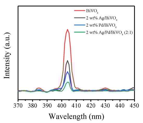 Photoluminescence (PL) spectra are often used to study the excitation and transfer of photogenerated carriers in photocatalytic semiconductor materials. When the PL signal is low, the separation rate of photogenerated electron and hole pairs is high. The excitation wavelength of the materials tested in Figure 6 is 320 nm. Ag/Pd/m-BiVO4 (2 wt%, 2:1) nanocomposite has the lowest PL signal. The results show that the recombination rate of photoinduced electron and hole pairs can be effectively inhibited by modifying Ag and Pd on the surfaces of m-BiVO4 nanospheres.