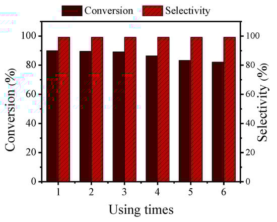 When the amount of catalyst added was 50 mg, the conversion rate was the best in Table 4. When the amount of catalyst used is small, it cannot generate enough photogenic charge carriers and cannot provide enough specific surface area, resulting in the lack of active substances and active sites involved in the reaction. When the amount of catalyst used is large, a large amount of photocatalyst is suspended in the reaction liquid, which scatters the incident light, thus affecting the reaction [].