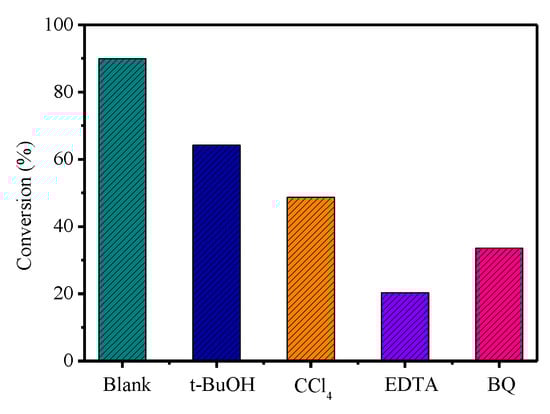 To explore the active species in the reaction, a capturing experiment of active species was carried out. With 2 mmol of benzyl alcohol as the reactant and 5 mmol of four quenchers, namely, ethylenediaminetetraacetic acid (EDTA), tert-butyl alcohol (t-BuOH), 1,4-benzoquinone (BQ) and carbon tetrachloride (CCl4), were added as quenching agents for h+, •OH, •O2− and e-, respectively, the results are shown in Figure 11. The experimental results showed that the reaction quenching was the most obvious when EDTA was added, the conversion rate decreased significantly when BQ and CCl4 were added, the conversion rate decreased slightly when t-BuOH was added. Therefore, the reaction was mainly completed through the synergistic effect of h+, e-, •OH and •O2−.