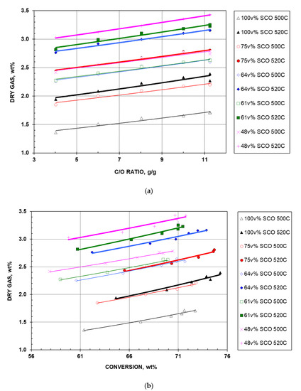 (a) Dry gas yield vs. C/O ratio at two reaction temperatures; (b) Dry gas yield vs. conversion at two reaction temperatures.