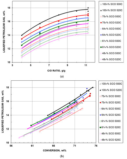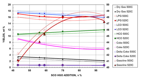 Figure 8 shows the relationship between SCO HGO addition and product yields at two temperatures and at 72 wt% conversion where the 75% feed exhibits the maximum gasoline yields (Figure 4b). Key observations are as follows.