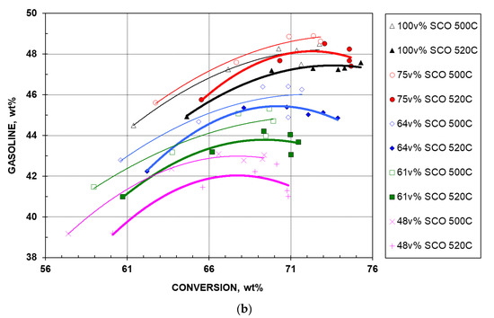 - Figure 4a was converted into Figure 4b through the conversion–CTO relationship that is shown in Figure 1. In Figure 4b, over-cracking phenomena are observed at 520 °C with an overall general trend, indicating that the occurrence of over-cracking depends on the aromatic content of the feed—when aromatics content is higher, the maximum appears at a lower conversion. Higher temperature can shift over-cracking to a lower conversion. The above observation agrees well with our previous finding [14]. Figure 4b also confirms the superior performance of the 75% feed, which gives the highest gasoline yield, as well as the order of performance of all five feeds at a given temperature.
