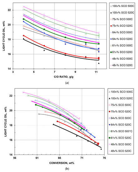 (a) LCO yield vs. C/O ratio at two reaction temperatures; (b) LCO yield vs. conversion at two reaction temperatures.