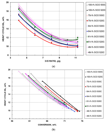 Figure 6b shows that as conversion increases, there are monotonic concave decreases in HCO yield. Again, in theory, all yield curves should merge at 100 wt% conversion with 0 wt% HCO. In a selectivity plot, the magnitude of HCO yield of a feed at a selected conversion should be reversed to that observed for LCO by using the relationship: HCO = 100 – conversion – LCO = Constant – LCO.