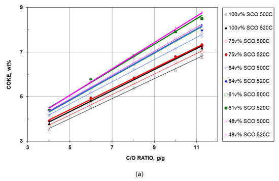 (a) Coke yield vs. C/O ratio at two reaction temperatures; (b) Coke yield vs. conversion at two reaction temperatures; (c) Delta coke vs. conversion at two reaction temperatures.