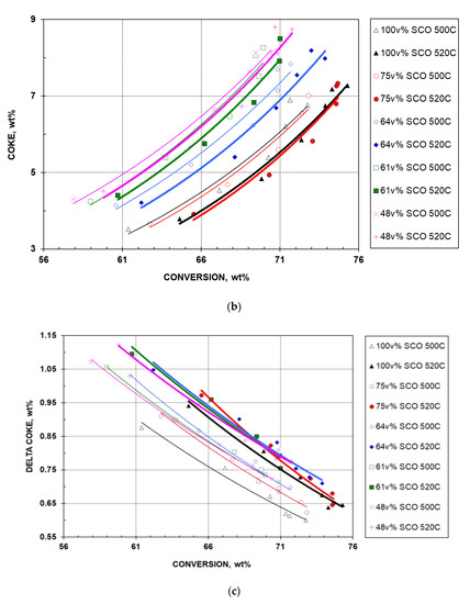 Figure 1 shows the relationship between conversion and CTO for SCO HGO and its four blends with bitumen HGO at 500 and 520 °C. In this figure, the thinner curves with unfilled symbols are for the lower reaction temperature (500 °C), whereas the thicker curves with filled symbols are for the higher temperature (520 °C). Key observations from this figure are summarized below.