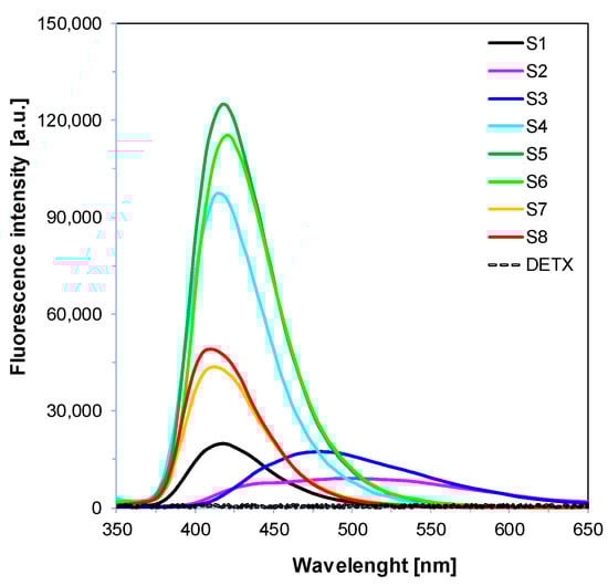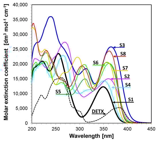 The 2-amino-4,6-diphenyl-pyridine-3-carbonitrile derivatives (S1–S8) were synthesized by a modified procedure described previously in the literature. The structure and purity of obtained products were confirmed by 1H NMR, 13C NMR and LC–MS analyses (see Supplementary Materials). Firstly, the absorption characteristics of the synthesized 2-amino-4,6-diphenyl-pyridine-3-carbonitrile derivatives were investigated in acetonitrile solutions (Figure 1). For efficient photoinitiation, the selection of a suitable photoinitiator is critical; therefore, it is necessary that the spectrum of the photoinitiator overlap with the emission spectrum of the light sources. As shown in Figure 1, derivatives of 2-amino-4,6-diphenyl-pyridine-3-carbonitrile exhibit maximum long-wavelength absorption in the range 349–365 nm, and peak extinction coefficients within 12,000–28,000 [dm3∙mol−1∙cm−1]. Their maximum extinction coefficients and the corresponding wavelengths are reported in Table 1.