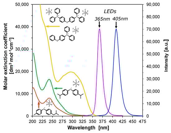 Comparison of absorption spectra of common cationic photoinitiators with emission spectra of 365 nm UV-A LED and visible LED at 405 nm.