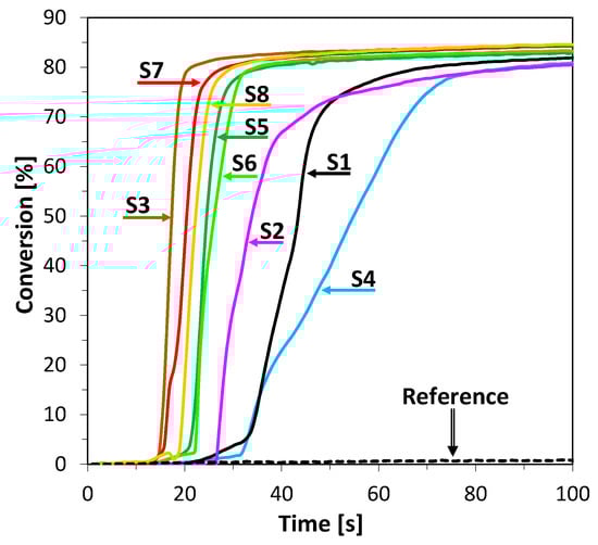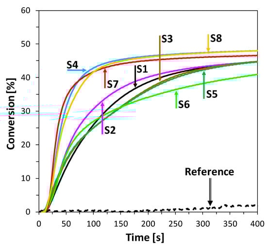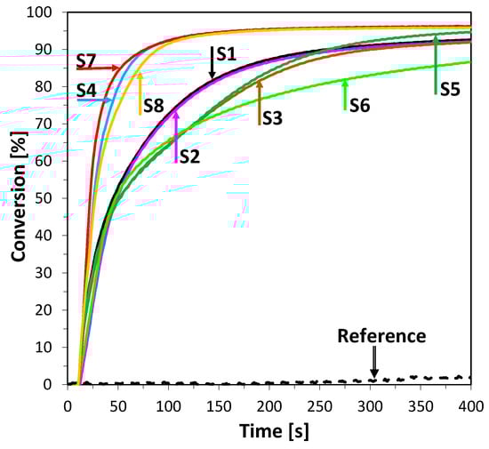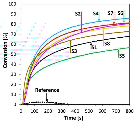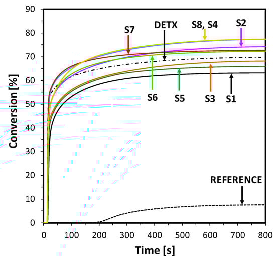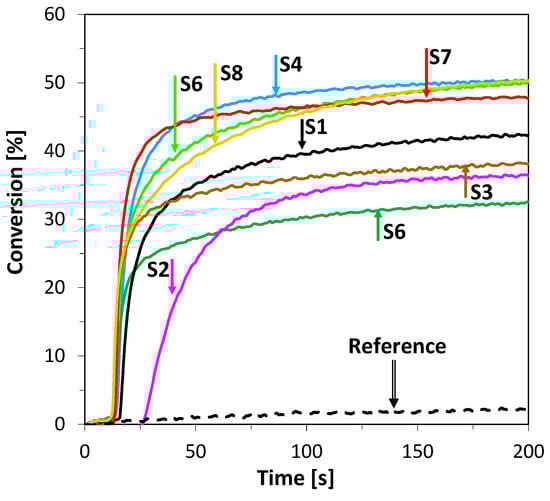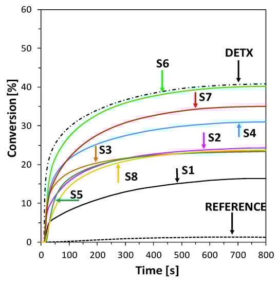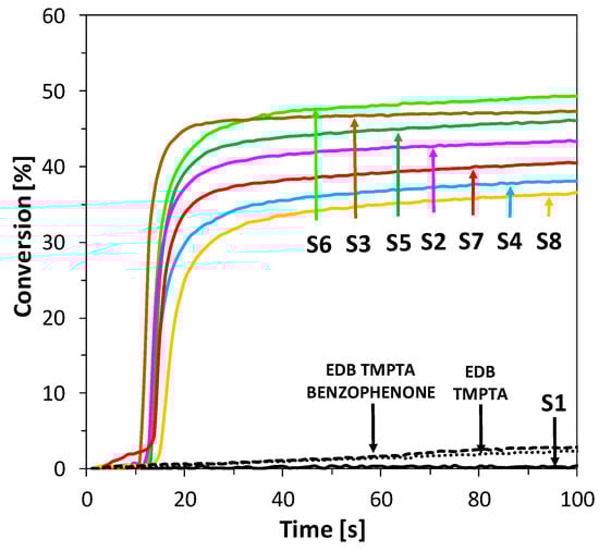 Photosensitization of iodonium salt using 2-amino-4,6-diphenyl-pyridine-3-carbonitrile derivatives in photoinitiated free-radical polymerization of acrylate monomers trimethylolpropane triacrylate (TMPTA) was also found to be a highly efficient process at 365 nm wavelength. Moreover, the polymerization rate enhancement effect of this process can be easily increased by elevating the power of the LED light sources used. The conversion of double bonds of TMPTA was measured by real-time FTIR and the results are shown in Figure 7. In this case, all compounds, excluding S1 and S2, showed similar kinetics at the beginning of the process but differed in overall conversion. The most promising results were observed for compounds S4 and S7, where polymerization kinetics and final conversion yielded high values. It can be observed that, in this process, the highest conversions were reached by compounds characterized by the lowest value of Gibbs free energy of electron transfer (Table 2 and Table 3).