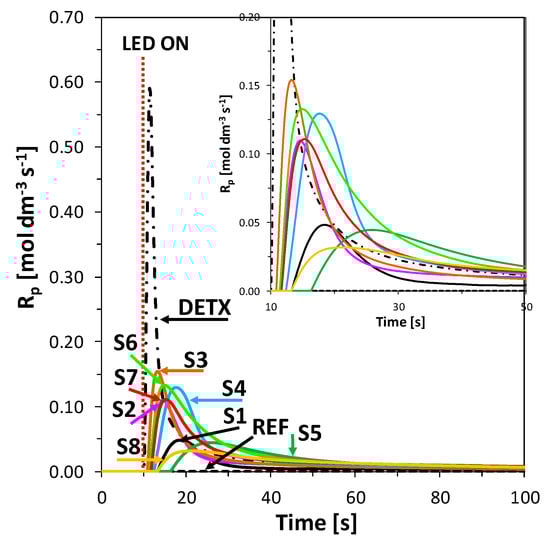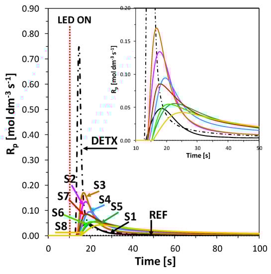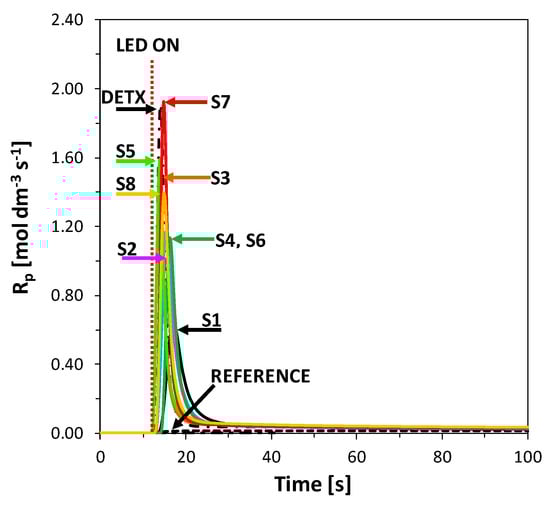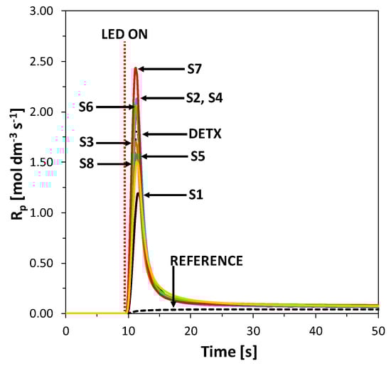 Polymerization rate profiles for photopolymerization of TMPTA with HIP (1 wt.%) and 2-amino-4,6-diphenyl-pyridine-3-carbonitrile derivatives (0.1 wt.%) under MPM lamp with 400–500 nm filter (intensity at the surface of sample 75 mW/cm2) irradiation, calculated from photo-DSC data. The irradiation starts at t = 10 s.