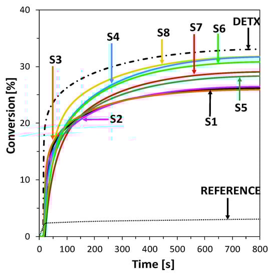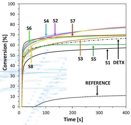 Compositions with bimolecular photoinitiating systems based on S1–S8 and iodonium salt (HIP) in free-radical formulation with TMPTA exhibited favorable kinetics and high conversion of functional groups. The value of monomer conversion for compound photoinitiating systems based on S2, S4, and S6–8 is even better than for commercial photosensitizer 2,4-diethyl-9H-thioxanthen-9-one (DETX). The best conversions during the photopolymerization process under a visible LED source and broad band lamp with a 400–500 nm filter were observed for compounds 2-amino-4-(4-methylthiophenyl), 6-phenyl pyridine-3-carbonitrile (S4), and 2-amino-4-(4-methoxyphenyl)-6-(4-methylthiophenyl)-pyridine-3-carbonitrile (S8). Composition with compound 2-amino-4-(4-methylthiophenyl)-6-(4-methoxyphenyl)-pyridine-3-carbonitrile (S7) showed great Rp value, which means that polymerization speed at formulation in this composition was the best.