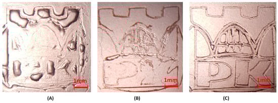 Micrography of the print obtained from cycloaliphatic epoxide monomer (CADE) with a bimolecular photoinitiating system based on; (A) DETHX/HIP (0,1%/1% w/w), (B) S1/HIP (1%/1% w/w), (C) S8/HIP (1%/1% w/w).