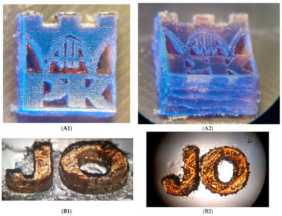 Micrography of (A) logo of Cracow University of Technology. The print was obtained from purely cationic photosensitive formulations based on vinyl monomer (TEGDVE) with S8/HIP (0.5%/1.0% w/w) photoinitiating system. (A1) View from the top under a UV-LED source of light with a maximum emission at 365nm; (A2) side view at 45o under a UV-LED source of light with a maximum emission at 365nm. (B) Object showing the initials “JO”; (B1) print obtained from purely cationic photosensitive formulations based on cycloaliphatic epoxide monomer (CADE) with an initiating system consisting of a double layer print from the formulation of CADE monomer with S8/HIP (1%/1% w/w), mono-layer height 1 mm; (B2) top view of 3D print.