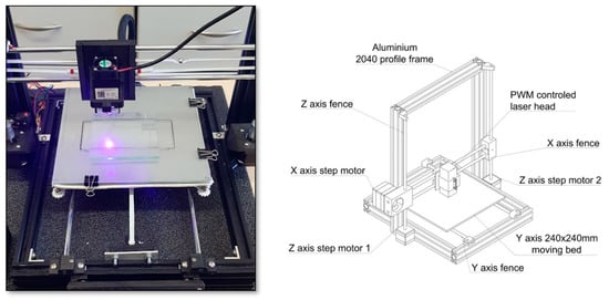 The second experiment involved the printing of a multilayer combination on a home-made 3D printer consisting of a CNC machine equipped with a 1500 mW 405 nm diode laser (NEJE PWM Laser Module, from Shenzhen Zhixinjie Technologym Shenzen, Guangdong, China) (Figure 22). This equipment stands out, as it has a constant laser beam and adjustable laser power. These are advantages affording better control of the amount of light applied to the cured formulation.