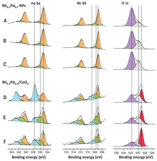 NAP-XPS spectra of Pd 3d, Rh 3d and O 1s recorded over model Rh0.5Pd0.5 NPs (A to C) and Rh0.5Pd0.5/CeO2 catalyst (D to F) under steam reforming of ethanol (SRE) conditions at 823 K. The photon energies used were 670 eV (A and D), 875 eV (B and E) and 1150 eV (C and F). Reprinted with permission from [68], copyright 2014, Science.