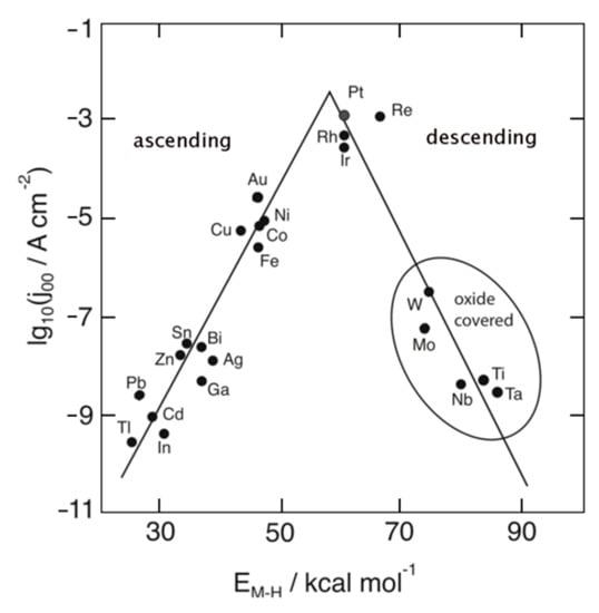 According to the Sabatier principle, the interaction of the reaction reactants/intermediates with the catalyst has to be optimal in strength. If it is too weak, the reactants will not bind to the catalyst and the reaction will not be able to take place. In other words, reactants do not get activated by such catalysts. On the other hand, if the interaction is too strong, the catalyst active sites will be blocked by reactant, intermediate or product molecules, leaving no active sites available for new reactant molecules that would continue the reaction. In other words, the catalyst surface will be (irreversibly) poisoned. Obviously, the intermediate’s adsorption energy is of crucial importance for catalyst efficiency. In the case of HER, this relates to the adsorption energy of atomic hydrogen (Eads(H)). The relationship between the logarithm of the exchange current density (log|j00|) and the energy of hydride formation (EM–H) was found by Trasatti [] in the form of a “volcano” curve (Figure 1). EM–H was used instead of Eads(H) since that data was not available at the time []. HER exchange current density varies by 5–6 orders of magnitude depending on the electrode material (Figure 1), with the highest rates on electrode materials with an optimal interaction of hydrogen intermediate with the catalyst surface-Pt-group metals.