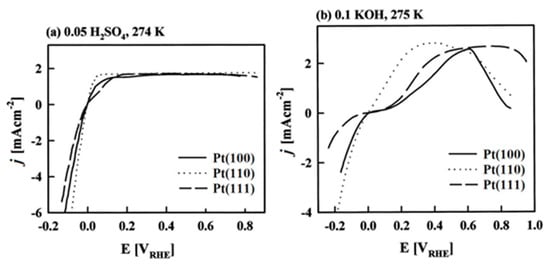Polarization curves for hydrogen evolution/oxidation on Pt(hkl), with potential sweep rate of 20 mV s−1, in (a) acid and (b) alkaline environments. Adapted from Reference [], Copyright (2002), with permission from Elsevier.