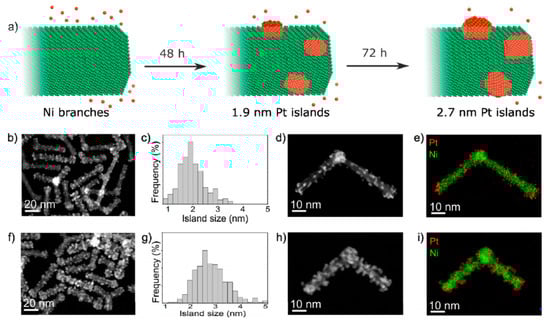(a) Scheme illustrating the growth of Pt atoms (red) directly on a Ni branch (green). (b) TEM image of the Ni-branched Pt-islands nanoparticles after 48 h (1.9 nm Pt-island). (c) Pt island size distribution. (d) HAADF-STEM image of a Ni-branched 1.9 Pt-island nanoparticle. (e) STEM-EDX map showing Pt (red) islands on Ni (green) nanoparticle. (f) TEM image and (g) Pt island size distribution after 72 h (Ni-branched 2.7 nm Pt-island). (h) HAADF-STEM image of a Ni-branched 2.7 nm Pt-island. (i) STEM-EDX map with Pt (red) and Ni (green). Reprinted (adapted) with permission from []. Copyright (2019) American Chemical Society.