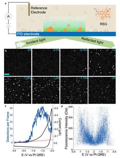 (a) A scheme of the experimental setup used for imaging H2 nanobubbles in electrocatalytic water splitting. H2 nanobubbles generated on an ITO surface are labeled by single R6G molecules and imaged by TIRF microscopy. (b) A series of TIRF images of a 22.8 × 22.8 μm2 area on an ITO electrode taken from a potential scan from 0 V to −2.0 V at 100 mV/s vs. Pt QRE in water containing 1 M Na2SO4 and 10 nM R6G. Fluorescence images were recorded at 19.81 frames per second with a 50-ms exposure time. (Scale bar, 5 μm.) (c) A comparison between the rate of nanobubble detection (detections per frame) (blue) and the current-voltage response recorded on the same electrode (black). The red dashed line indicates the baseline of the faradaic current. (d) A scatter plot showing the fluorescence intensity (counts) of individual H2 nanobubbles in the potential range of interest from −0.5 V to −2.0 V from the same recording. The photon counts of each fluorescent burst on one frame were converted from the total integrated fluorescence signal under the fitted 2D Gaussian function using Thunder STORM. Adapted from Reference []. Copyright 2018 National Academy of Sciences.