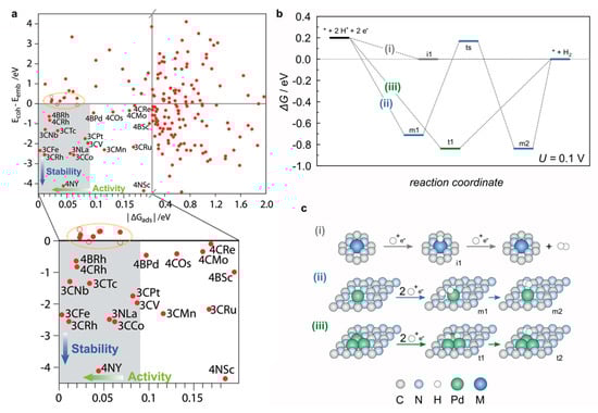 (a) Descriptor-based screening results of transition metal embedded graphene (TMEG) catalyst candidates based on activity (|ΔGads|) and stability (Ecoh – Eemb). The lower-left quadrant of (a) contains materials that passed both criteria. For comparison, the gray shaded region covers the range of |ΔGads| that a Pt (111) surface could have depending on the coverage of hydrogen. Note the different scales in the left and right sides of the horizontal axis. Adapted from Reference [], copyright (2015), with permission from John Wiley & Sons. (b,c) influence of active site nuclearity of single Pd atoms (ii) and Pd trimmers (iii) in the thermal part of HER versus an idealized single atom active site (i). (Values for (ii) and (iii) are originally computed as hydrogen activation and taken from reference [].