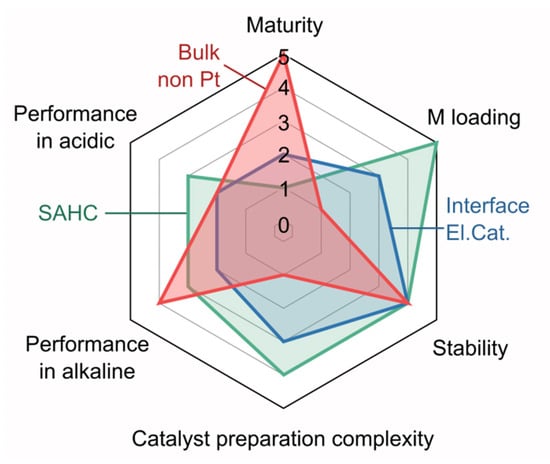 Comparison of the analyzed groups of electrocatalytic systems presented in this review (Authors’ view). We consider maturity, metal loading (M loading), stability (under operating conditions), the complexity of the catalyst preparation, the overall performance in alkaline solutions, and the overall performance in acidic solutions. Note that in the case of the catalyst preparation complexity case, higher grade means more complex preparation.