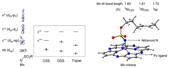 The other powerful factors influencing reactivity are the electronic effects from the Pz ligand and MnIII metal. As shown in Figure 2, four stronger electronegativity of N vs. C atoms remarkably increases ability to accept electrons of Pz ligand, makes a less electronic Mn–N reactive center and lead to a Mn(Pz)-nitrene with higher electrophilic reactivity than Mn(Por)-nitrene, consistent with observed experiments [38]. In metal-center terms, Mn(III) (d4) has less d-electrons compared to FeIII (d5), which indicates a poorer π-backbonding effect from Mn(III) to N1 and a more electron-deficient nitrenoid N atom, thus a stronger electrophilicity for Mn(Pz) than Fe(Pz).