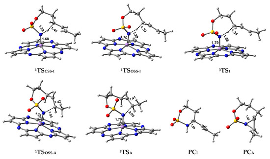 As shown in Figure 3, 3TSI is 9.9 kcal/mol lower in energy than 3TSA (5.4 vs. 15.3 kcal/mol) while triplet amination and aziridination pathways are exothermic by −13.5 kcal and endothermic by 6.3 kcal/mol, respectively, which indicates that C–H amination significantly is both kinetically and thermodynamically favorable over C=C aziridination for Mn-catalyzed system, excellently consistent with the experimental I:A > 20:1. This extraordinary chemoselectivity toward C−H amination can be explained by the following. Firstly, the p–π conjugation in triplet 3TSI lowers the activation energy of the amination. This role of the p–π conjugation in the selectivity of intramolecular reactions is also reflected on the intermolecular: aromatic over aliphatic alkenes in aziridination reactions catalyzed by [(MeCN)(L)Mn-NCMe)]− [33]. Secondly, the Pz is a π-conjugated macrocyclic ligand with good planarity and strong rigidity. It is difficult for Pz to make a pocket-like space to accommodate other approaching atoms in the reaction process. Namely, nitrenoid N atom above Pz is sterically inaccessible. As seen in Figure 4, 8-membered ring moiety of 3TSA “lie” above the Pz plane whereas moiety of 3TSI “stand” above the Pz plane. Obviously, “lie” mode has a much larger steric repulsive-force between Pz ligand and sulfamate substrate compared to “stand” mode, which greatly lead to a higher energy barrier for 3TSA than for 3TSI. Thermodynamically, a 7-membered ring and a 3-membered ring in the aziridination product PCA indicate much larger tension than 6-membered ring in amination product PCI. It further inhibits C=C aziridination competition.