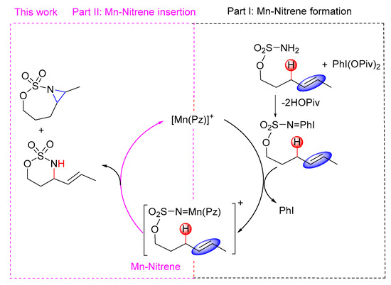 The N p orbital character of frontier orbitals, a strong electron-withdrawing porphyrazine ligand and a high-valent MnIII metal lead to high electrophilic reactivity of Mn-nitrene. This is supported by the relative experimental results that both Mn(Pz)-catalyzed intramolecular C−H amination/C=C aziridination can be executed at approximately regular temperature.