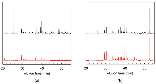 Gas chromatograms of solid-phase-extracted odour components after tobacco smoke adsorption (= 0 h of visible light irradiation) (black) and 24 h (red) of visible light irradiation. (a) Non-woven fabric with Fe/TiO2; (b) non-woven fabric without Fe/TiO2.