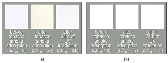 We could observe that, after tobacco smoke adsorption, the non-woven fabric with TiO2 dramatically changed colour, due to the uptake of the tar components (Figure 3a). The colour difference (evaluated with the ΔE*ab scale) of the fabric after tobacco smoke adsorption at 0 h compared to the fabric before tobacco smoke adsorption was 5.4. After 24 h of UV irradiation, the ΔE*ab value, relative to the colour of the fabric before tobacco smoke adsorption, became 0.6; these colour differences can be easily perceived by the naked eye, with the 24-h sample looking almost white (Figure 3a, right end). This indicates that the adsorbed tar components had almost entirely decomposed after UV irradiation in the presence of the photocatalyst [6]. On the other hand, the colour of the non-woven fabric without TiO2 did not change significantly after tobacco smoke adsorption (ΔE*ab = 0.7, Figure 3b).