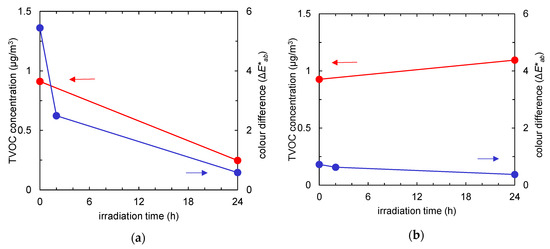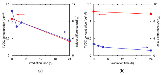 Time course of total volatile organic compound (TVOC) concentration (red) and colour difference (the ΔE*ab value compared to the colour of the fabric before tobacco smoke adsorption, represented in blue) of the fabrics after tobacco smoke adsorption vs. UV irradiation time. (a) Non-woven fabric with TiO2; (b) non-woven fabric without TiO2.