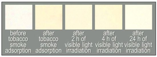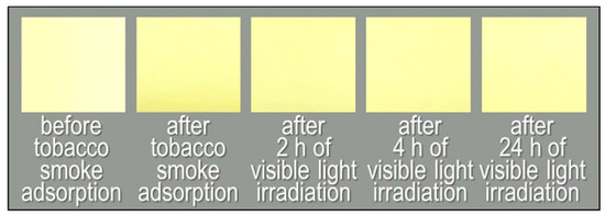 Photographs of the non-woven fabric with Fe/TiO2 before tobacco smoke adsorption, after tobacco smoke adsorption (0 h) and after 2, 4, and 24 h of visible light irradiation.