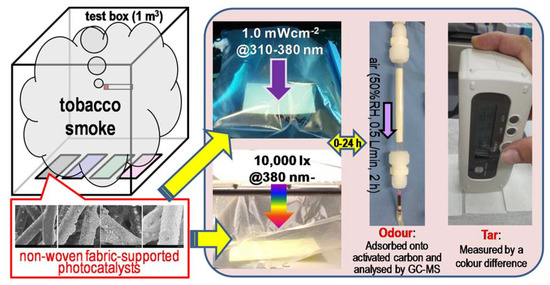We described the methods employed to analyse the adsorption and decomposition of cigarette smoke pollutants by using a newly developed system—use of photocatalyst-embedded non-woven fibres. By considering three different photocatalysts, TiO2, Fe(III)-grafted TiO2, and Cu(II)-grafted WO3, we assessed the magnitude of odour and tar constituent adsorption on the fabric fibres as well as their decomposition after specific visible light or UV irradiation periods. Among the three tested materials, the non-woven fabrics containing Fe/TiO2 yielded superior results when considering the expansion of our technology for practical applications. Compared to previously reported photocatalyst systems used for the removal of tobacco smoke components, our technique achieved higher removal ratios, as exemplified by the TVOC decomposition ratio under both UV and visible light irradiation. However, studies focusing on the fundamental understanding of the adsorption and decomposition of the odour and tar constituents of tobacco smoke trapped on clothes or other materials remain few. We believe that our study makes a significant contribution to literature because the engineering of smart materials, such as fabrics, that can intrinsically degrade cigarette smoke components is crucial in today’s society, where third-hand smoke, the pollution of objects with cigarette smoke, is causing increasing numbers of health problems. We believe our proposed technology, with its simple fabrication process and effective ability, will facilitate the exploration of smart materials that can overcome the concerning effects of cigarette smoke.