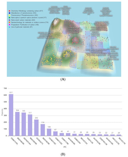 Patents involving CDs synthesis and applications are few, as most related research deals with the synthesis and applications of metal-containing QDs. The first CD-related patent (filed in 2010) describes a method of producing water-soluble fluorescent carbon dots from carbon soot []. CDs with sizes of 2–7 nm were oxidatively treated to introduce hydrophilic surface carboxyl groups in amounts that are sufficient for fluorescence []. Another patent disclosed a single-step hydrothermal method of preparing water-soluble biomass-derived fluorescent CDs from cellulose and urea []. The prepared CDs were subjected to centrifugation, dialysis, and lyophilization to obtain solid-state CDs, which showed promising water solubility, low toxicity, good biocompatibility, and could be potentially used for cell imaging []. The recently described production of nitrogen-doped fluorescent CDs from milk at a moderate temperature (100–120 °C) within a short time (20–40 min.) [] paves the way to the low-cost large-scale production of fluorescent CDs with a size distribution of 2–10 nm. In 2017, two patents describing the preparation of biomass-derived CDs were filed [,]. One of these patents describes a method comprising the consecutive steps of biomass impregnation and hydrothermal carbonization for 1–5 h at 150–350 °C in the presence of one or more activators, such as KOH, NaOH, K2CO3, KHCO3, Na2CO3, and NaHCO3 [], which affords CDs with a uniform size distribution and an average size of 5 nm. Another patent describes the synthesis of biomass tar–derived CDs via a catalytic reaction of a molecular sieve/tar mixture at 300–800 °C, followed by sonication [], which provides well-dispersed CDs with a high QY. The categories of patents that are related to CDs are illustrated by the overall patent analysis and international patent classification (IPC) groups presented in Figure 3A. The top groups of filed patents and the numbers of filed patents, as demonstrated in Figure 3B, involve chemistry/metallurgy containing carbon, modified nanoparticles utilizing carbon source, co-doped carbon, biomass hydrothermal, and microwave synthesis for sun-light excitable carbon dots, as well as the application of CDs exhibiting luminescence, e.g., electroluminescence, chemiluminescence, photonics, and sensors, as well as CDs that are suitable for bio-related applications, such as imaging, dressing, and photothermal treatment.