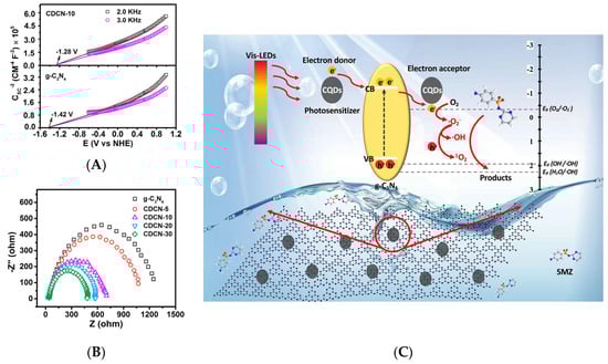 (A) Mott–Schottky plots. (B) Electrochemical impedance spectroscopy of g-C3N4 and CDs/g-C3N4. (C) Photocatalytic mechanism of sulfamethazine catalyzed by CDs/g-C3N4 under visible LED irradiation; Reprinted with permission from [] published by Elsevier, 2020.