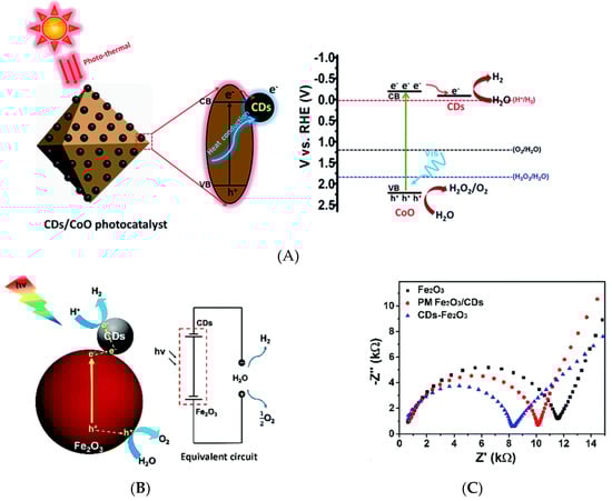 (A) The mechanism of visible-light driven water splitting by carbon dots decorated on octahedral CoO surface- Reproduced with permission from []—published by The Royal Society of Chemistry, 2017. (B) Water splitting mechanism of CDs/Fe2O3 under visible light and the equivalent circuit, and (C) Electrochemical impedance spectra of Fe2O3, physically mixed CDs and Fe2O3 (PM Fe2O3/CDs), and CDs/Fe2O3—Reproduced with permission from [] published by The Royal Society of Chemistry, 2018.