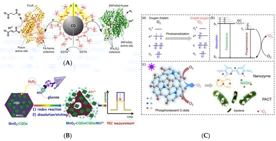 Recent years have witnessed significant progress in the application of CDs as photosensitizers and photodriven nanozymes [,,]. Hutton et al. [] reported light-driven enzymatic catalysis by CDs for a system of simultaneous hydrogenation and hydrogen production. Positively charged ammonium-doped CDs (CD-NHMe2+) allowed for the photoexcited electrons to be transferred to negatively charged fumarate reductase (FccA) for the reduction of fumarate to succinate via hydrogenation with a turnover number of 6,000 mol succinate per mol FccA within 24 h, as demonstrated for system A in Figure 10A. Simultaneously, CD-NHMe2+ could enhance solar hydrogen generation by transferring photogenerated electrons to [NiFeSe]-hydrogenase (H2ase) for hydrogen production via proton reduction with turnover numbers of 43,000 mol H2 per mol H2ase in 24 h, as demonstrated for system B in Figure 10A. In contrast, negatively charged CDs with carboxyl groups (CD-COO−) exhibited little or no effect on both of the reactions []. Lin et al. [] designed a CD-based dual optical and photoelectrochemical immunosensing system for monitoring aflatoxin B1 (AFB1) in food, which achieved highly selective AFB1 detection in a magneto-controlled immunoreaction system (Figure 10B). GOx delivered on the tag oxidized glucose to gluconic acid and H2O2 once the immunocomplexes of GOx-labeled bovine serum albumin-AFB1 were formed. Subsequently, MnO2 nanosheets on the MnO2-CD–coated electrode reacted with H2O2 to induce the dissociation of CDs and photocurrent decline. The detection of AFB1 was achieved in the range of 0.01–20 ng mL−1, with a detection limit of 2.1 pg mL−1 (ppt) []. The established immunoassay demonstrated satisfactory accuracy and good reproducibility. Zhang et al. [] used phosphorescent CDs as a photo-oxidative nanozyme for antimicrobial photodynamic inactivation, achieving 92 and 86% growth inhibition efficiencies against Escherichia coli and Salmonella under light irradiation, respectively. In contrast, phloxine B, which is a commercial photosensitizer, displayed inhibition efficiencies of only 40 and 55%, respectively. Figure 10C(a) illustrates the photodriven activation of oxygen on the photosensitizer to produce singlet oxygen from triplet O2, which is the cheapest, most abundant, and environmentally friendly oxidant. Promising photosensitizers facilitate the transition of fluorescence to phosphorescence with a high yield of the triple state, and the photosensitization efficiency is proportional to phosphorescence (Figure 10C(b)). CDs exhibited the activity of an oxidase-mimicking nanozyme, as confirmed by the strong absorbance at ~652 nm, due to the photo-oxidation of TMB (Figure 10C(c)). Similarly, a CD/polydimethylsiloxane composite was reported to exhibit photodynamic antibacterial activity against E. coli, Staphylococcus aureus, and Klebsiella pneumonia under blue-light irradiation for only 15 min. [].