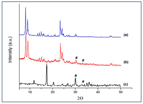 X-ray diffraction patterns of the (a) ZSM-5 and (b) Mn3O4/ZSM-5 (c) Mn3O4 (# Mn3O4 peaks JCPDS: 24–0734).