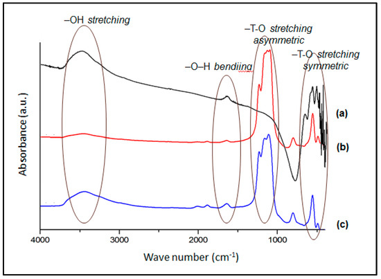 FTIR analysis of ZSM-5 zeolites and manganese oxide-modified counterpart is summarized in Figure 2. The infrared spectra of hierarchical Mn3O4/ZSM-5 zeolite (Figure 2b) was compared to that of hierarchical ZSM-5 zeolite (Figure 2c) and Mn3O4 (Figure 2a). The figures show that all the peaks observed in the hierarchical ZSM-5 zeolite were also observed in the Mn3O4/hierarchical ZSM-5 zeolite. However, there is a difference in the intensity of the broad band located at 3500–3000 cm−1, which is a typical absorption band assigned to the stretching vibration of water-hydrogen bonded silanol group (ν-Si–OH) or internal silanol groups [22]. The intensity of the silanol band in Mn3O4/ZSM-5 decreased, suggesting that the Mn-oxide species were located on top of the silanol groups, thus they interacted with the –OH, thereby leading to a decrease in the water content of the water-hydrogen bonded –Si-OH group. In addition, Figure 2 shows the presence of Mn3O4 where the FTIR spectra indicate two characteristic emission bands located around 613 and 509 cm−1, a typical absorption band coupling between Mn−O stretching at the finger print area [23]. In addition, there were more than two absorption band peaks around 615 and 513 cm−1, which can be attributed to the coupling modes between the Mn–O stretching, while the band around 429 cm−1 can be assigned as a band-stretching mode [24].